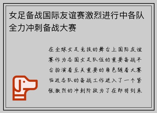 在全球女足竞技的舞台上,国际友谊赛作为各...
