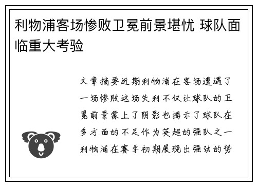 文章摘要: 近期,利物浦在客场遭遇了一场...