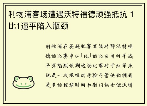文章摘要:利物浦在客场面对英超劲旅时展现...