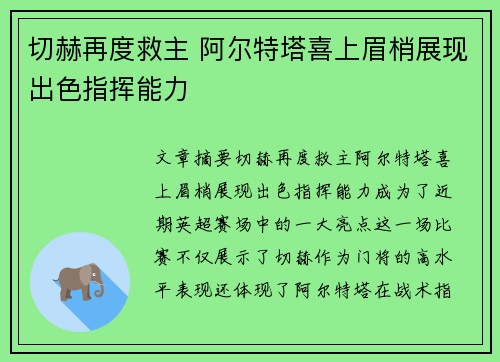 文章摘要:切赫再度救主,阿尔特塔喜上眉梢...