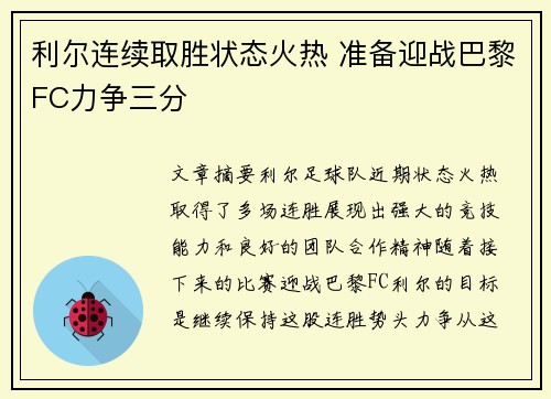 文章摘要:利尔足球队近期状态火热,取得了...