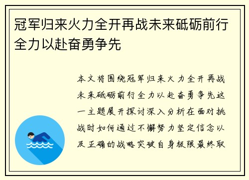 本文将围绕“冠军归来,火力全开,再战未来...