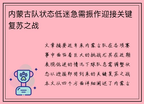 文章摘要:近年来,内蒙古队在各项赛事中面...