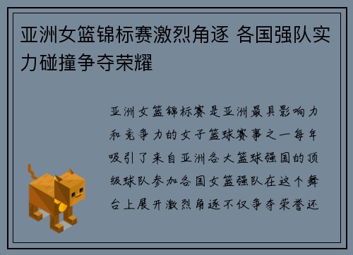 亚洲女篮锦标赛是亚洲最具影响力和竞争力的...