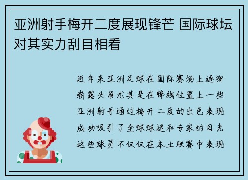 近年来,亚洲足球在国际赛场上逐渐崭露头角...