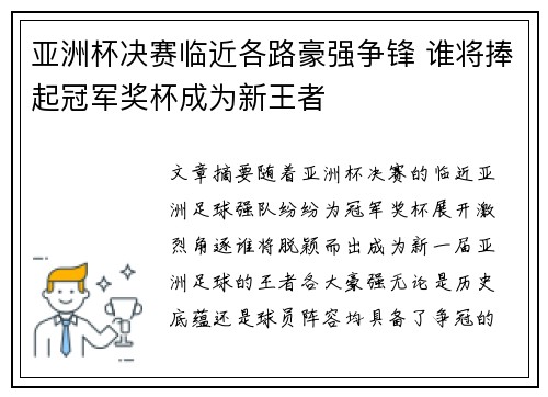 文章摘要:随着亚洲杯决赛的临近,亚洲足球...