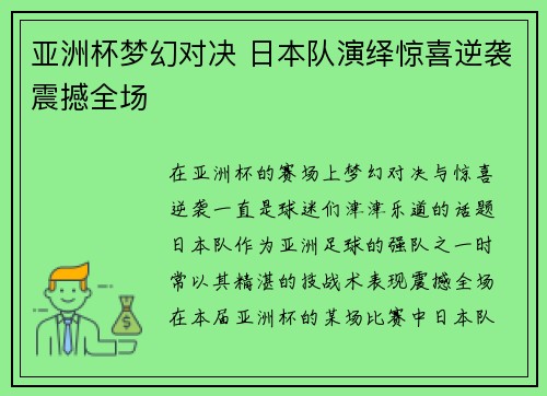 在亚洲杯的赛场上,梦幻对决与惊喜逆袭一直...