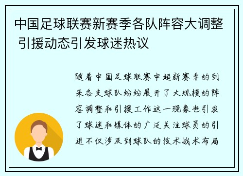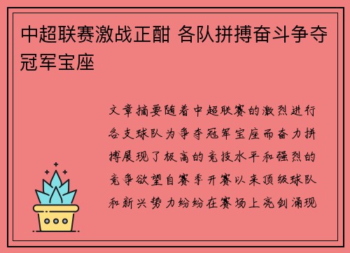文章摘要:随着中超联赛的激烈进行,各支球...