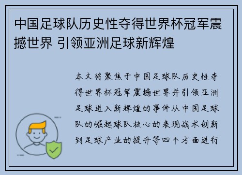 本文将聚焦于中国足球队历史性夺得世界杯冠...